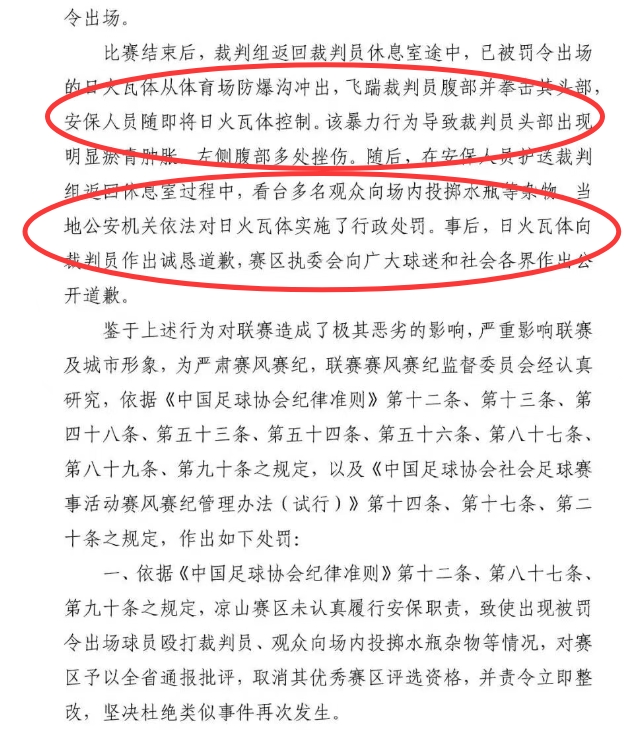 文件披露,被凉山球员日火瓦体飞踹的裁判 员头部出现明显瘀青肿胀,左侧腹部多处瘀伤 。当地公安机关依法对日火瓦体实施了行政处罚。