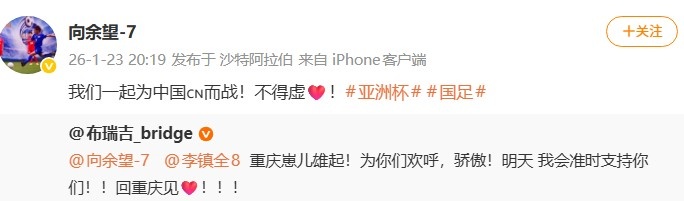 1月23日讯 U23亚洲杯总决赛 ,U23国足将对阵日本U23队。球员向余望更新社媒动态。