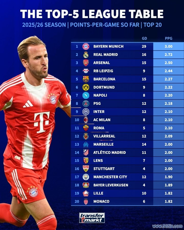 11月08日讯 德转统计了新赛季至今五大职业联赛 球队的场均积分榜,其中拜仁全胜场均3分排在榜首,苏超在线直播高清视频无插件皇马、阿森纳分列二三。
