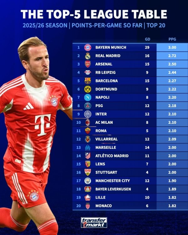西甲新浪新闻 11月08日讯 德转统计了新赛季至今五大职业联赛 球队的场均积分榜,其中拜仁全胜场均3分排在榜首,皇马、阿森纳分列二三。 2025/26赛季五大职 ...