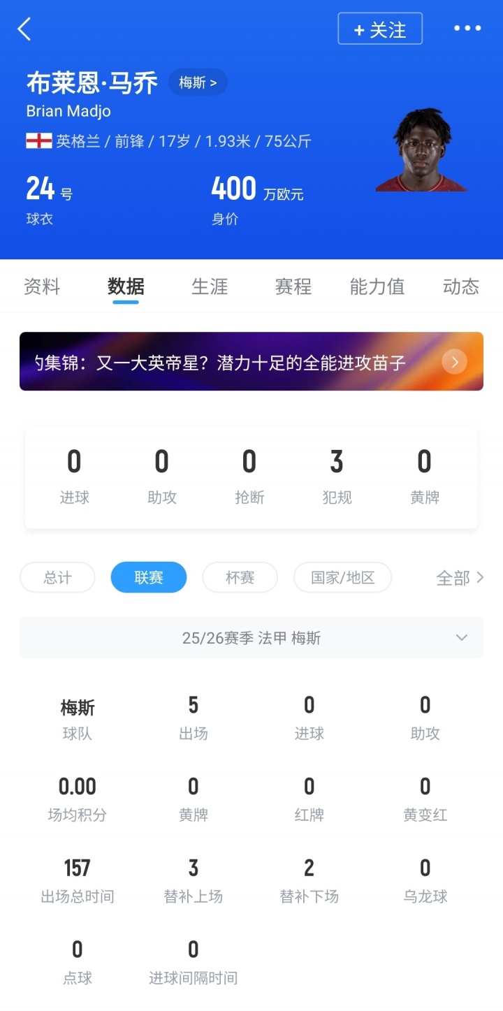 马乔,今天是他17岁的生日,苏超直播在线观看场上司职前场球员,身高1.93米,他本赛季为梅斯在法甲出场5次,其中2次杆位,出场时间共计157分钟。