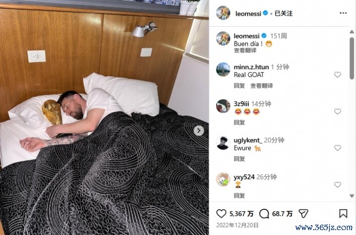 3-梅西社媒晒图抱着大力神杯睡觉:5367万
