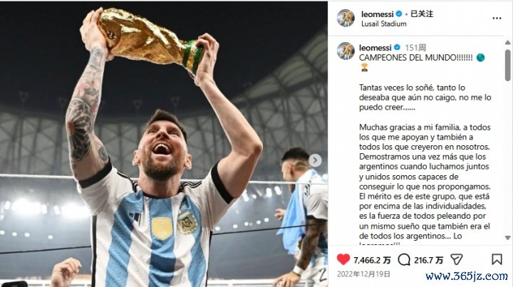 1-梅西社媒发文庆祝世界杯赛 夺魁 ,7466.2万