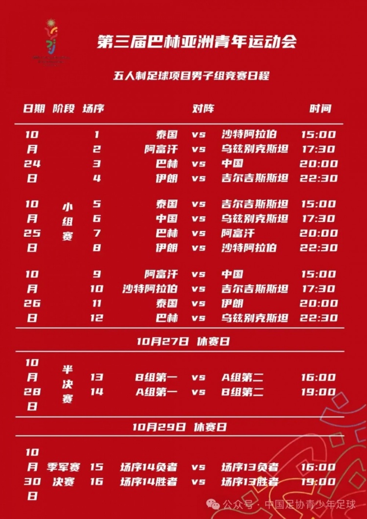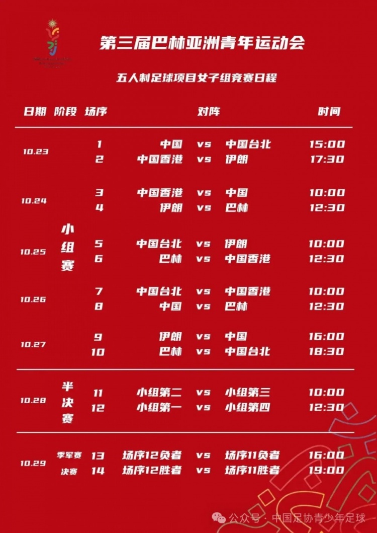 10月4日讯 10月22日-10月31日,第三届亚洲青年运动活动 会(以下简称“巴林亚青会”)将在巴林举行,本届赛事 首次将五人制古代足球 纳入正式赛事 项目bet365体育投注网站,中国队分别派出男、女队参赛。近日,巴林亚青会组委会公布五人制古代足球 项目竞赛日程。