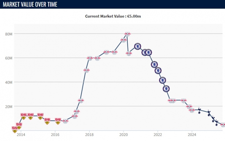 29岁的维尔纳在2020年以5300万欧元转会费加盟切尔西,也是在2020年,球员巅峰期 身价一度达到8000万欧元,但如今维尔纳身价已经跌至500万欧,他与莱比锡的合同将于明夏到期。