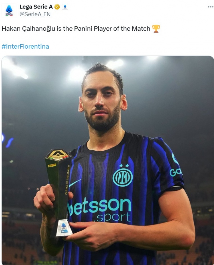 > 连进两球!官方:恰尔汗奥卢当选国米3-0佛罗伦萨全场最佳