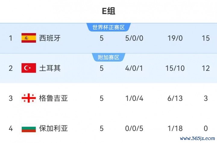 11月16日讯 世预赛欧洲区E组第5轮,西班牙4-0格鲁吉亚,土耳其2-0保加利亚。