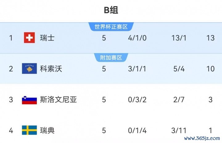 本组积分榜形势与E组相似:瑞士领跑 科索沃3分+11个净胜球bet365投注bet365在线投注平台,居小组头名;末轮双方直接对话,瑞士同样只要避免大比分输球就能确保晋级下一轮 ,直通2026年美加墨世界杯赛 正式比赛。